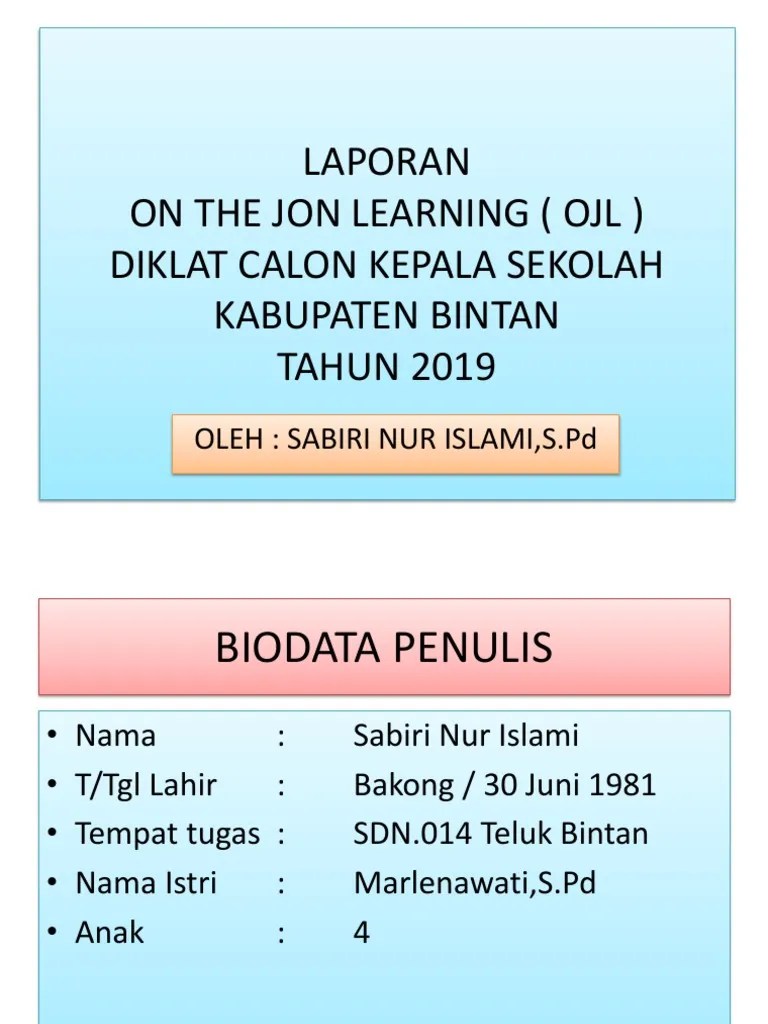Kegiatan on the job learning (ojl) sangat penting dilakukan bagi peserta diklat calon kepala sekolah dalam rangka untuk mempraktikkan kompetensi . Kegiatan on the job learning (ojl) penting bagi peserta diklat calon kepala sekolah untuk mempraktikkan kompetensi yang telah dipelajari selama kegiatan in . Kumpulan laporan ojl lengkap untuk calon kepala sekolah lengkap terbaru. Laporan on the job learning (ojl) disusun sebagai laporan akhir kegiatan on the job learning (ojl) pada pendidikan dan pelatihan calon kepala sekolah . Laporan ojl harus dipresentasikan dengan menggunakan power point dengan waktu 20 menit sekalian tanya jawab.